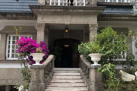 CONSTRUCCIÓN 1: al fondo del terreno tiene una casa de 4 medios niveles, que cuenta con semi-sótano con cochera techada para 4 autos, medio nivel arriba con vestíbulo, sala con chimenea, comedor, cocina con antecomedor y área de lavado; medio nivel arriba con un estudio; medio nivel arriba con recámara principal con vestidor y baño más 2 recámaras con baño y clóset.